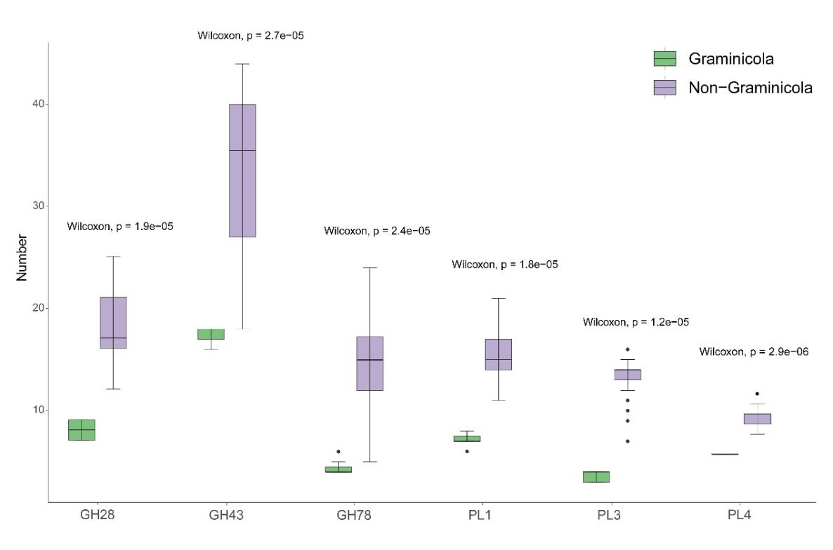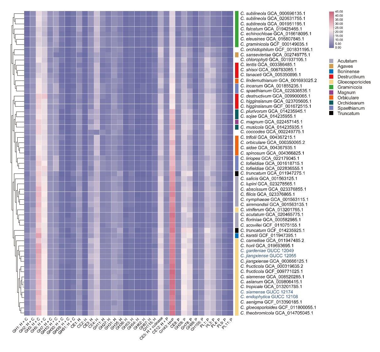 该研究从药用植物病斑或腐烂的药用植物上分离培养共计获得141株刺盘孢属真菌,确定了这些菌株属于8个复合种的23个物种,其中,7个新种,3个寄主新记录种,优势种为Colletotrichum siamense。同时,该研究尽可能多的对具有不同寄主范围和寄主偏好性的刺盘孢菌株进行比较基因组分析,发现普遍存在且寄主范围广的刺盘孢复合种含有更多的碳水化合物酶编码基因,而仅感染禾本科植物的禾生刺盘孢属复合种(Colletotrichum graminicola species complex)果胶酶编码基因的数量较其他复合种少。这一研究结果增加了对我国药用植物上刺盘孢属真菌多样性和分布的认识,为植物病害防控、致病机理及刺盘孢属真菌与寄主的互作研究打下了坚实基础。