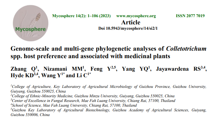 刺盘孢属(Colletotrichum)真菌被认为是全球第八重要的植物病原菌,引起大量作物的炭疽病,给农林经济造成严重损失。近日,伟德国际victor1946官网植物病理学科王勇教授和李诚副教授团队在真菌学领域著名期刊Mycosphere(IF=16.525)在线发表了题为“Genome-scale and multi-gene phylogenetic analyses of Colletotrichum spp. host preference and associated with medicinal plants”的研究论文,该论文调查了广西、贵州、四川和云南四省药用植物上刺盘孢属真菌的多样性,与此同时,揭示了刺盘孢属真菌碳水化合物降解酶编码基因与宿主范围和寄主偏好性之间的关系,为深入开展刺盘孢属真菌致病机理及其与寄主的互作研究提供了基础。