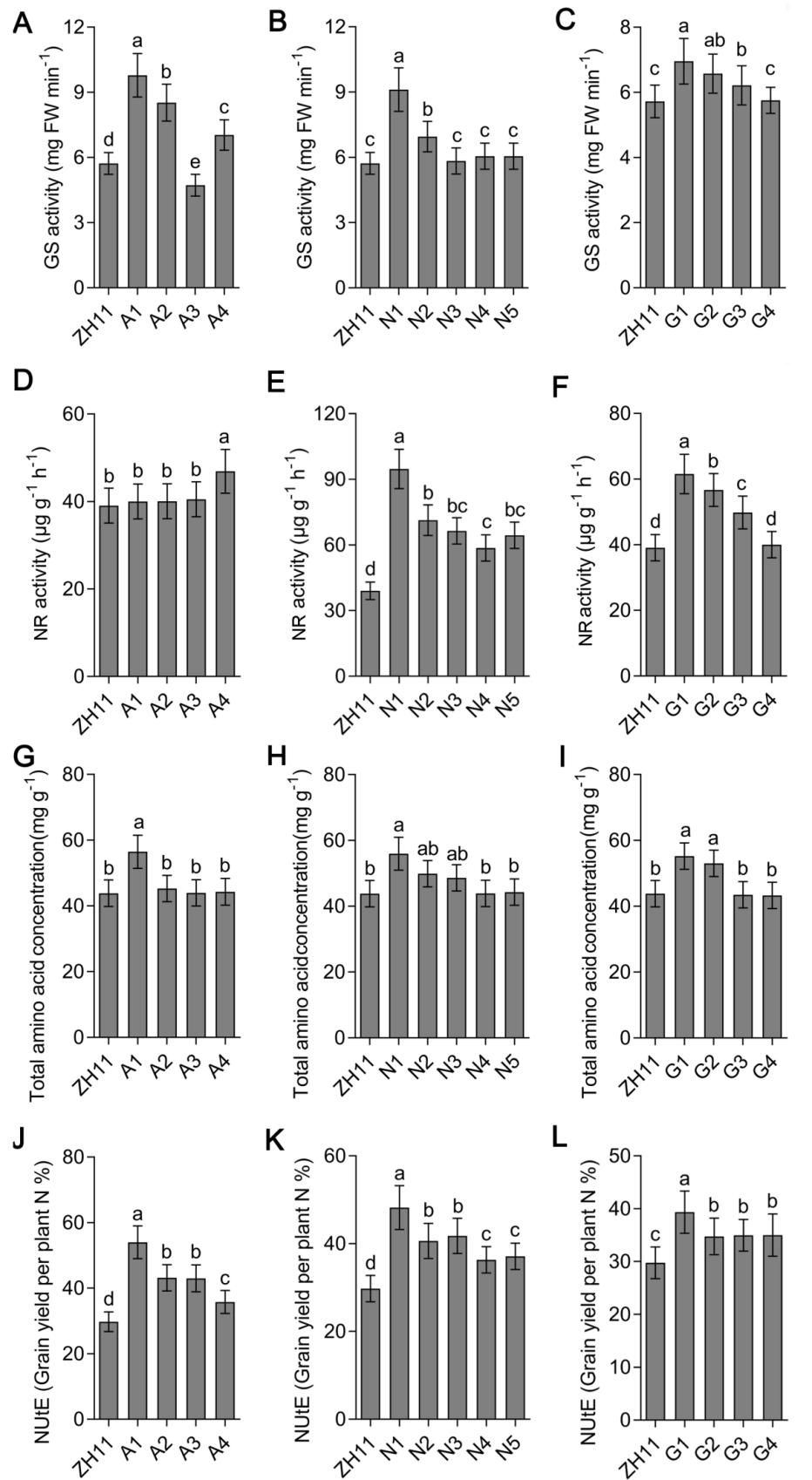 图5 对照中花11和各种水稻多基因聚合共表达材料的谷氨酰胺合成酶活性、硝酸还原酶活性、总氨基酸含量和氮利用效率