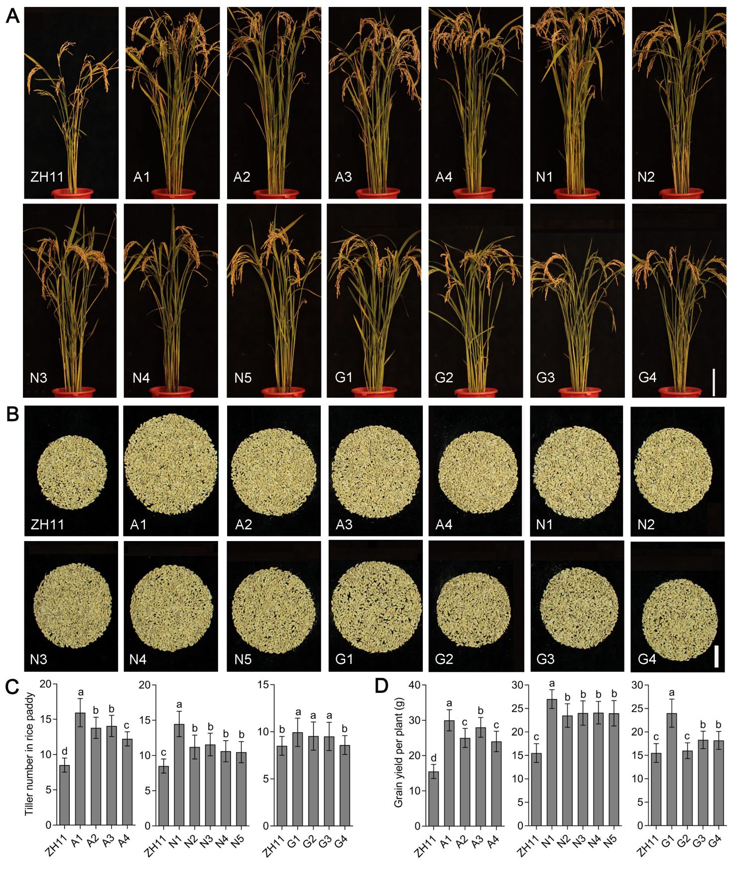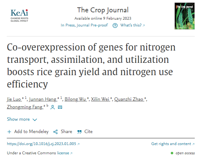 近日,伟德国际victor1946官网/水稻产业技术研究院方中明教授课题组在The Crop Journal(中科院农林类一区)在线发表了题为“Co-overexpression of genes for nitrogen transport, assimilation, and utilization boosts rice grain yield and nitrogen use efficiency”的研究论文,作者以粳稻中花11为背景材料,聚合了参与氮途径不同节点的关键基因,以促进硝酸盐和铵盐的吸收和同化,并加强氨基酸利用,以提高水稻的产量和氮利用效率。研究表明共同提高表达铵盐转运基因OsAMT1;2、谷氨酰胺合成酶基因OsGS1;2和天冬酰胺合成酶基因OsAS1是通过氮途径中的关键节点来系统性提高水稻单株产量和氮利用效率的一种有效育种策略。