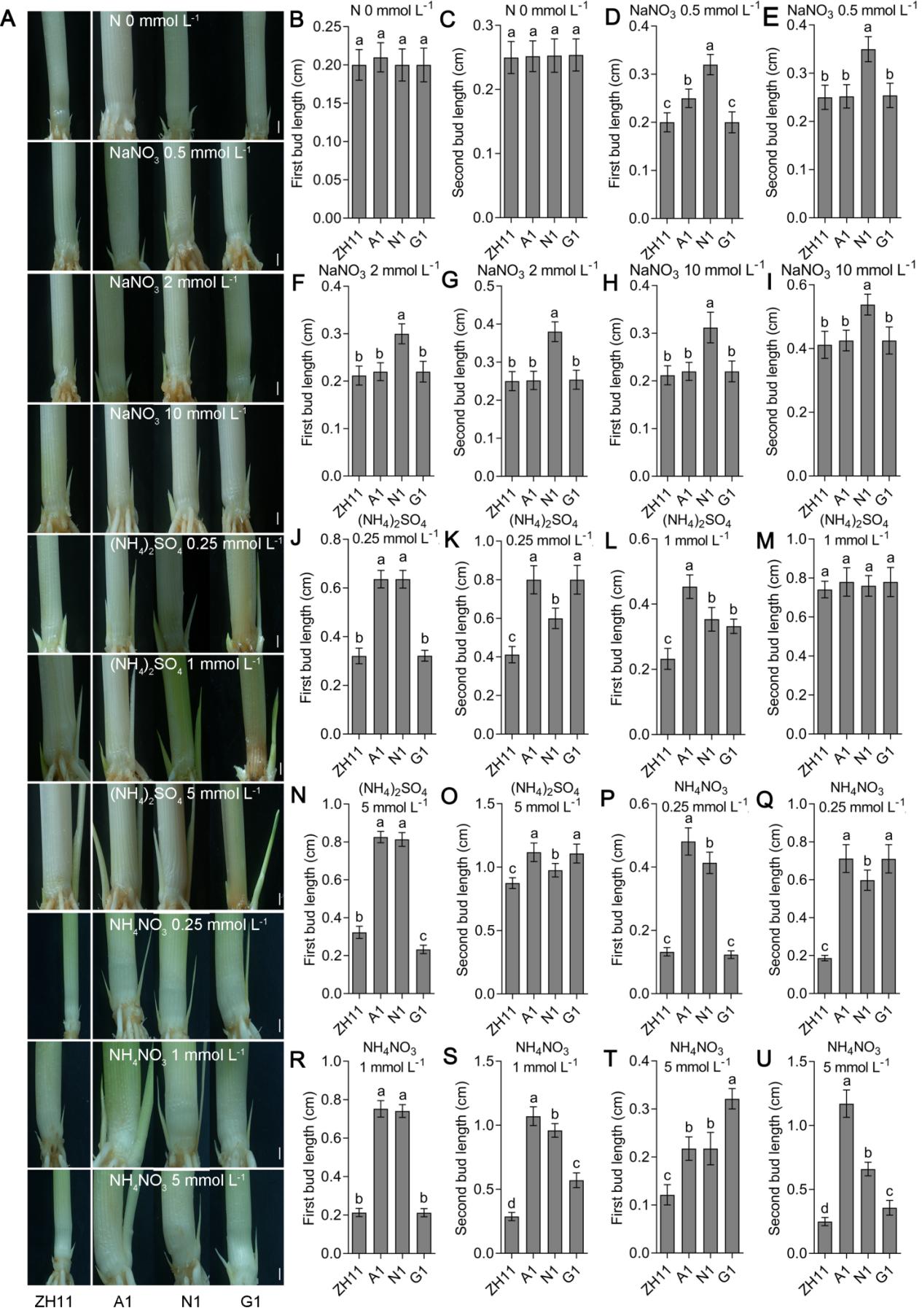 图3 不同氮处理下对照中花11和各种水稻多基因聚合共表达材料的第一和第二分蘖芽表型和长度