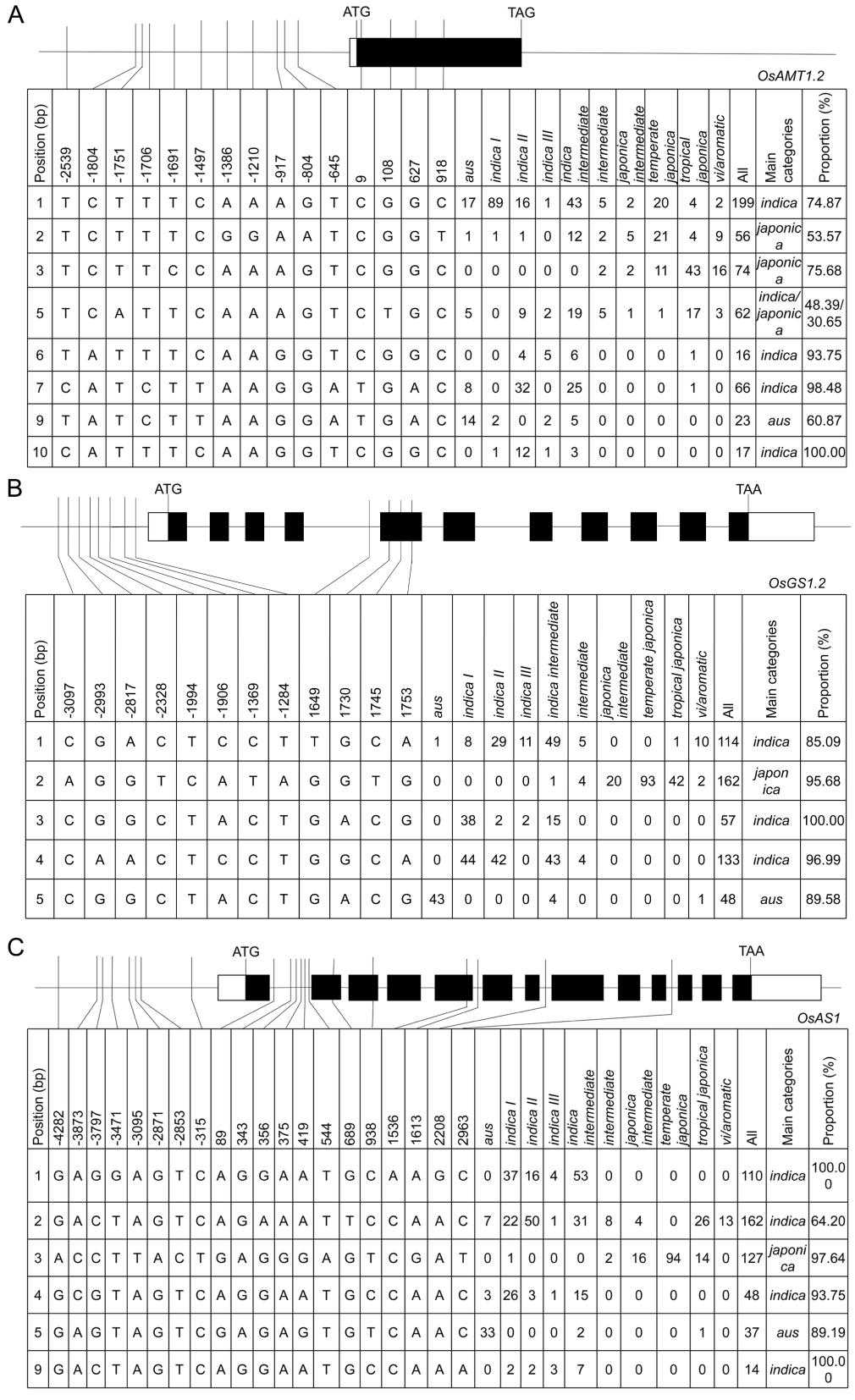 图1 水稻氮途径部分基因启动子序列的SNP与单倍型差异