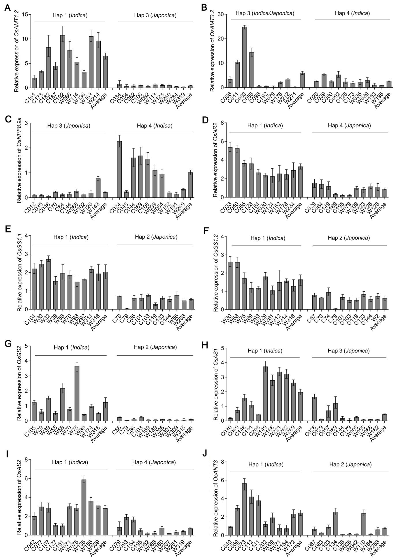 图2 氮途径相关基因不同单倍型中各个材料的相对表达量