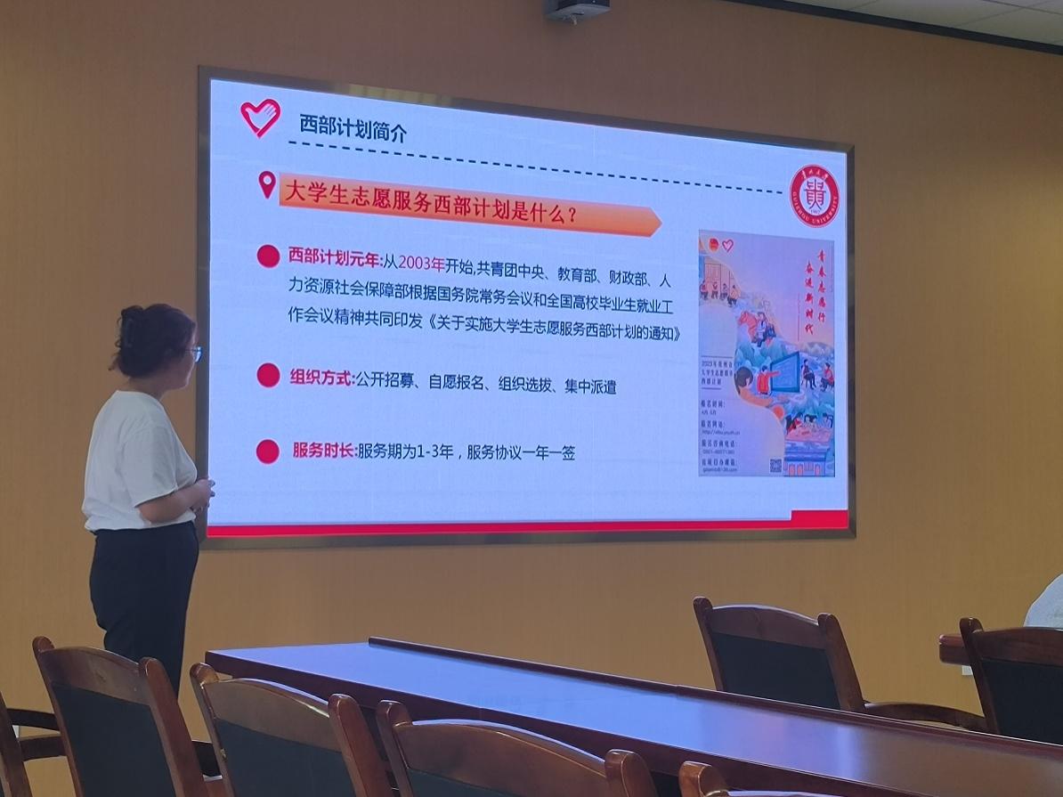 肖宇书记首先介绍了“西部计划”的意义和基本情况。随后,院团委组织部部长秦毅从项目类别、专项内容、西部计划考核时间安排、招募需求和要求等方面对“西部计划”进行详细讲解。